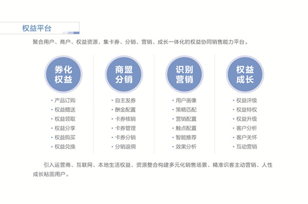 權益平臺,聚合用戶、商戶、權益資源,集卡券、分銷、營銷、成長一體化的權益協同銷售能力平臺。引入運營商、互聯網、本地生活權益,資源整合構建多元化銷售場景、精準識客主動營銷、人性成長粘固用戶。