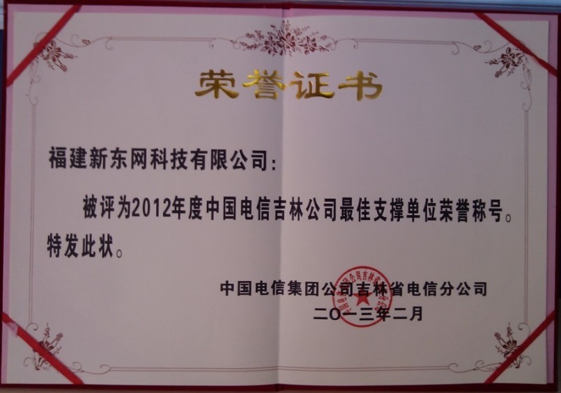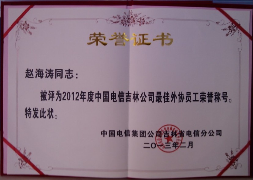 2012年經(jīng)過公司吉林省駐地電子渠道網(wǎng)掌廳運營和網(wǎng)上商城天翼賣場建設(shè)兩個項目組所有同事的不懈努力,我司從近百家吉林省電信公司的合作單位中脫穎而出,榮獲2012年度中國電信吉林公司“最佳支撐單位”榮譽稱號,同時駐地負責人趙海濤獲得吉林電信“年度最佳外協(xié)員工”榮譽稱號。