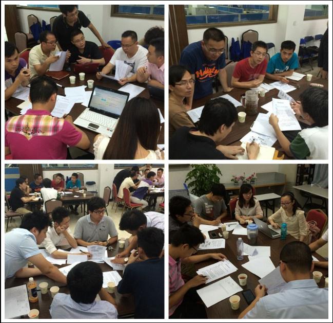 在詳細(xì)的背景介紹后,實(shí)戰(zhàn)演練正式開始——Kim現(xiàn)場(chǎng)將學(xué)員分組為4家虛擬公司,共同競(jìng)標(biāo)一個(gè)項(xiàng)目。通過探討、投標(biāo)、訪談、評(píng)析四大模擬競(jìng)標(biāo)環(huán)節(jié),在激烈的層層選拔中,員工的團(tuán)隊(duì)意識(shí)逐漸增強(qiáng),融入競(jìng)標(biāo)角色,表現(xiàn)積極。Kim表示:“做一名銷售很容易,但做一名好銷售相當(dāng)不易。除了日積月累的實(shí)踐經(jīng)驗(yàn),還要有好悟性,總結(jié)與反思很重要!”