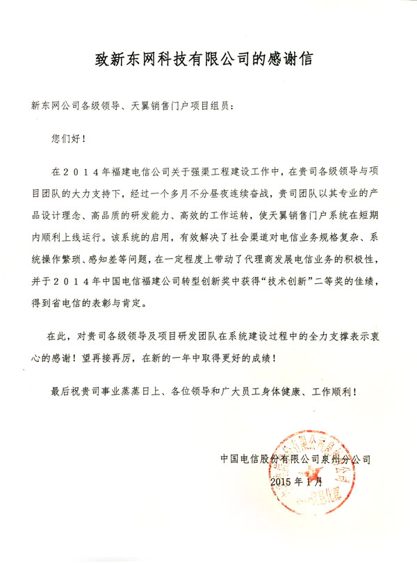 “有播種才有收獲”。今天,我們收到泉州電信的感謝信,這既是嘉獎,更是鼓勵,期盼我們的產品與方案能夠為更多客戶解決實際的問題,贏得更多客戶的信賴與滿意。